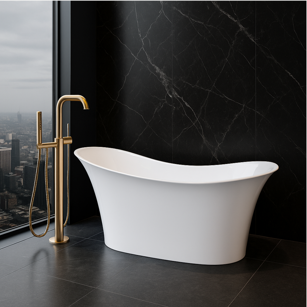 Fabricada em fibra acrílica de alta performance, a banheira alia leveza estrutural à durabilidade superior. O acabamento branco brilhante reflete luz com suavidade e proporciona uma estética limpa e atemporal — ideal para projetos que valorizam o bem-estar e o visual contemporâneo.