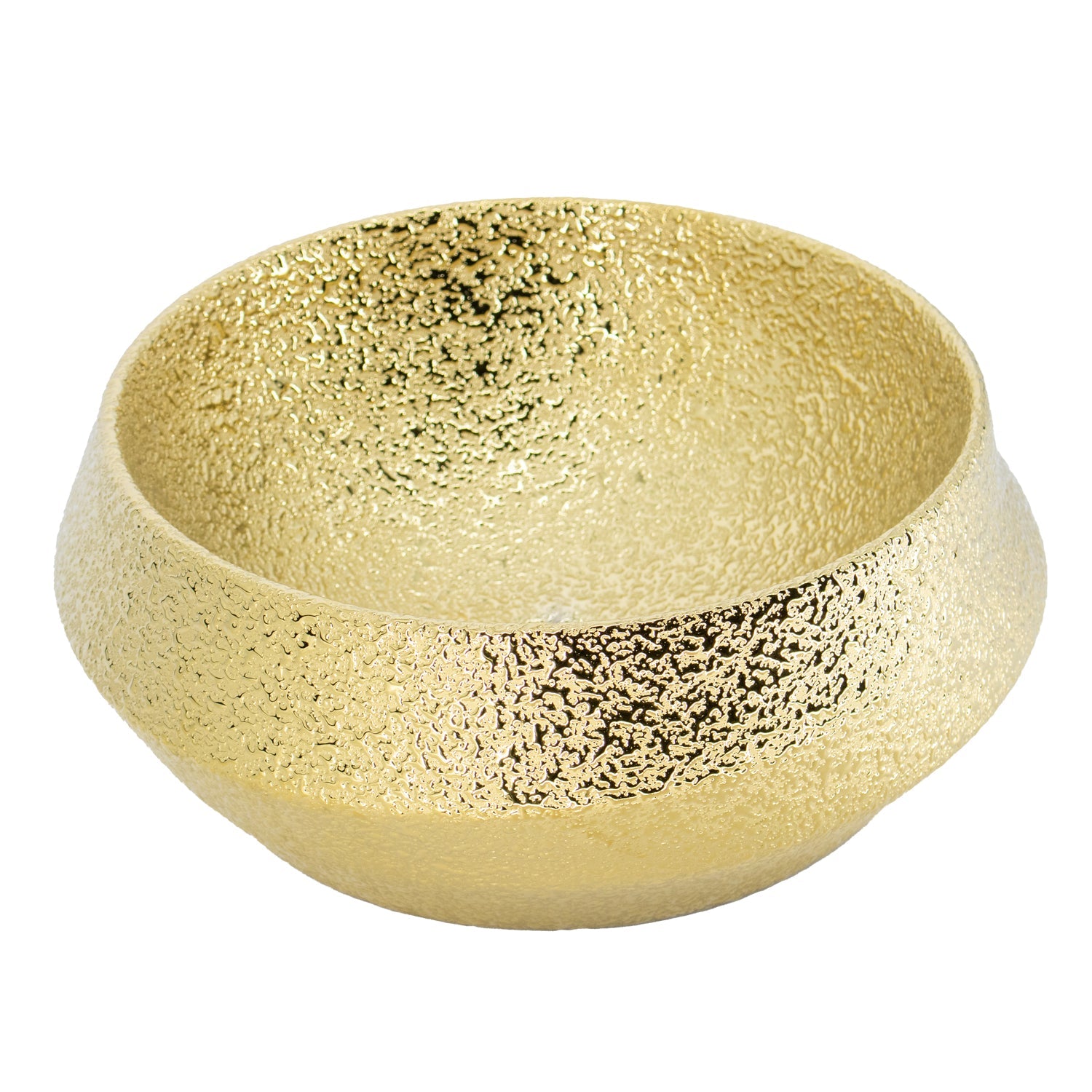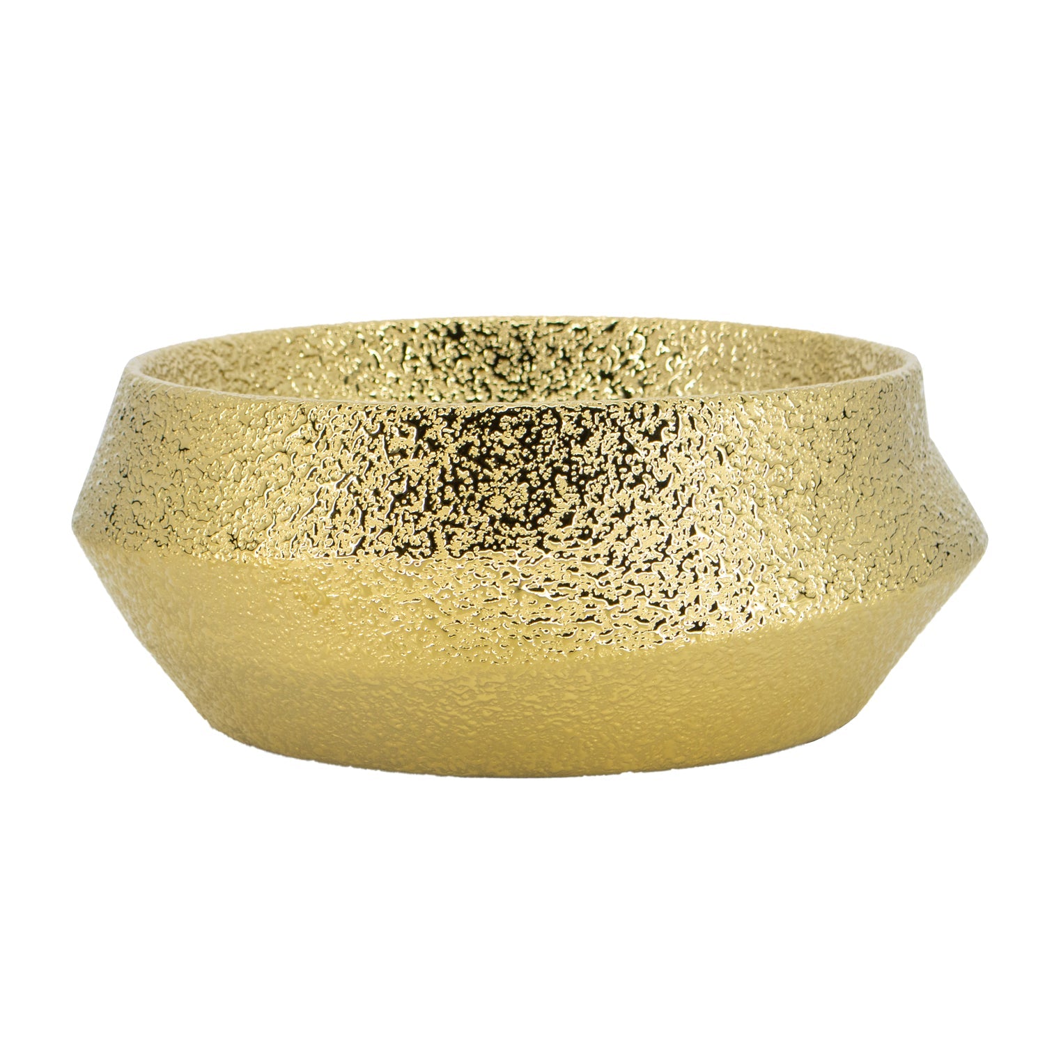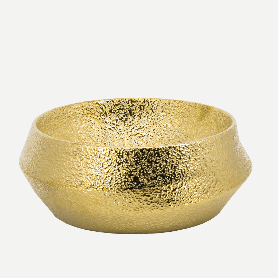 A textura externa martelada, aliada ao brilho intenso do tom gold, confere profundidade e refração à luz, criando um efeito visual sofisticado em diferentes ângulos. A silhueta geométrica com base levemente afunilada proporciona um visual moderno, com forte apelo decorativo.