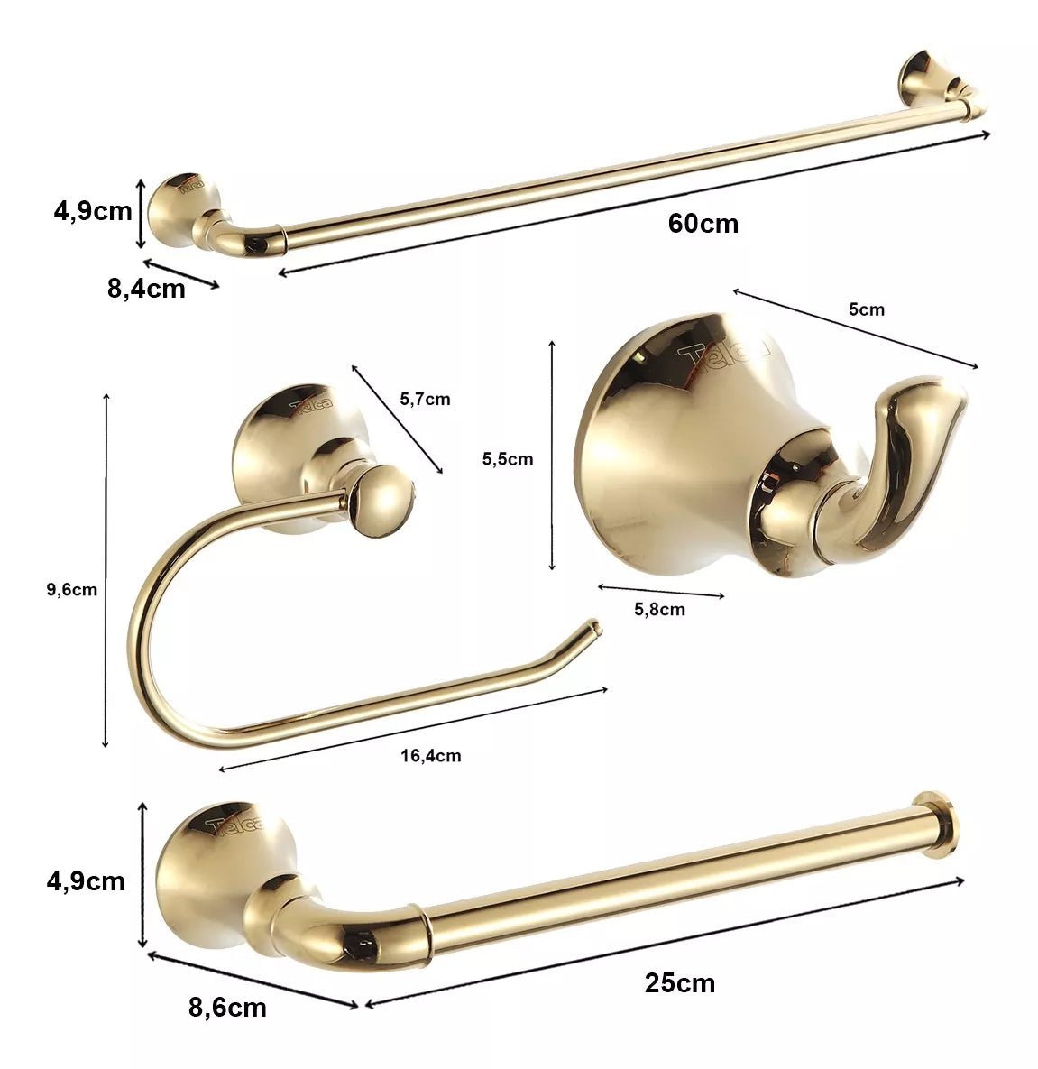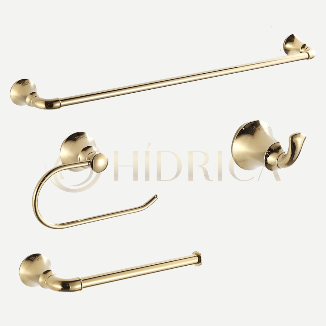 Material: Inox 304 Acabamento: Dourado Torneira: Para água fria, acionamento 1/4 de volta, bica baixa Válvula Click: Modelo 7/8, compatível com cubas de lavatório Dimensões do Kit de Penduradores: Toalheiro 60 cm | Papeleira 16 cm | Cabide 5 cm | Porta-Toalha de Rosto 25 cm Compatibilidade: Ideal para cubas embutidas, semi encaixe e sobrepor
