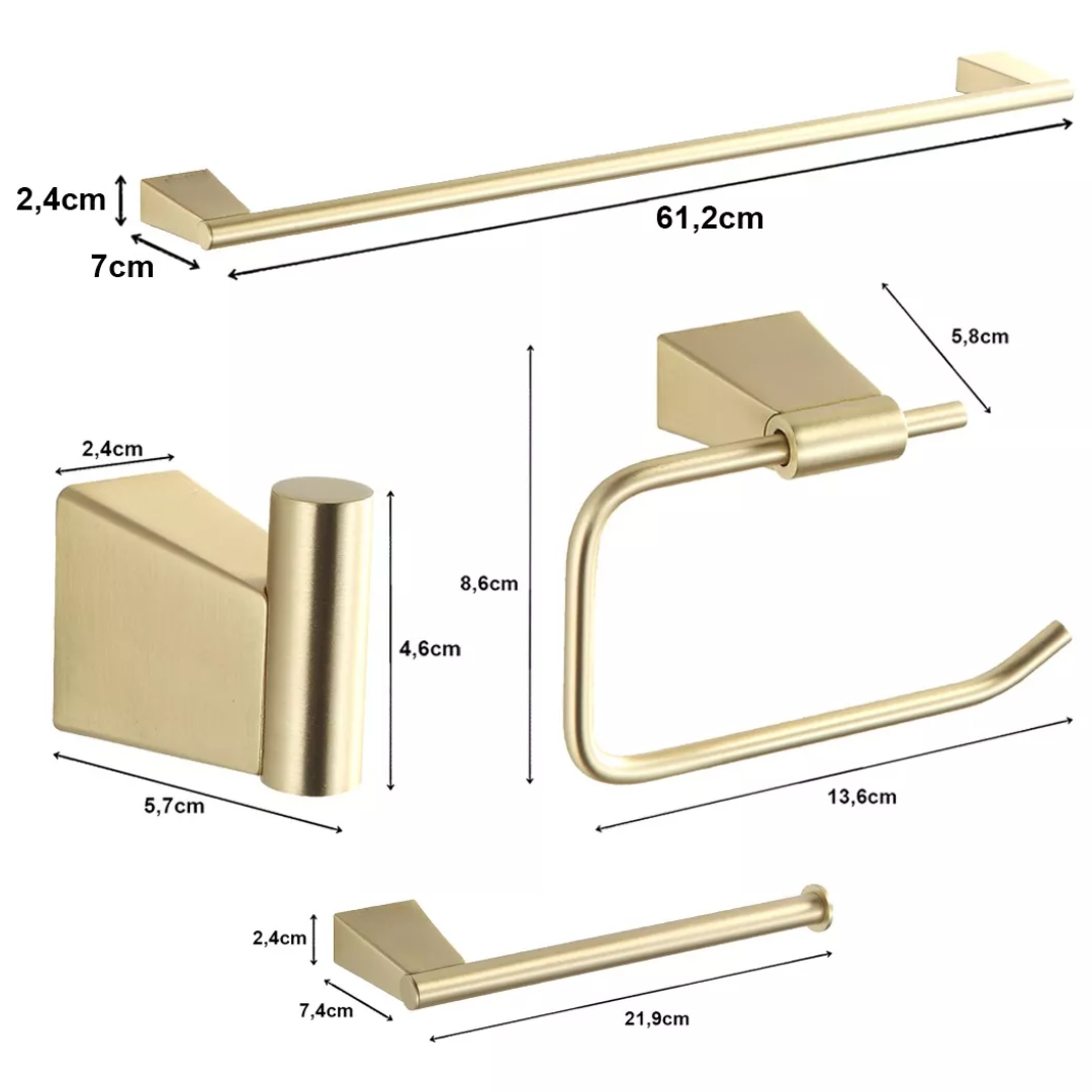 Design Funcional com Sofisticação Com linhas retas e acabamento escovado de alto padrão, cada peça do kit agrega valor ao ambiente sem abrir mão da funcionalidade. O tom dourado escovado foi cuidadosamente aplicado para manter a sofisticação ao longo do tempo, mesmo em ambientes úmidos.