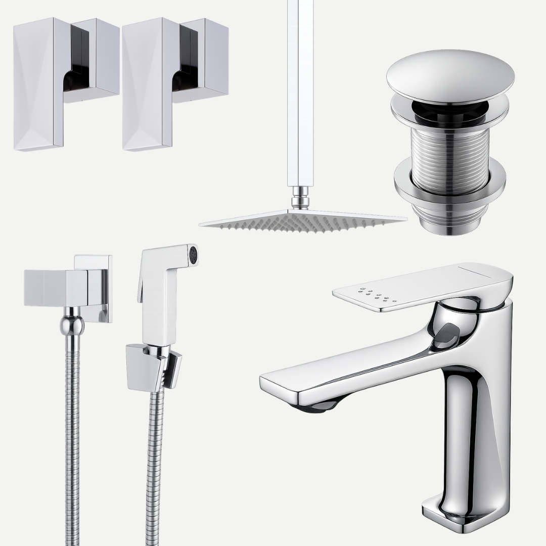 Composto por Torneira Monocomando Diamond, Ducha Higiênica Quadrada, Ducha de Teto 20x20 Inox 304, Acabamentos de Registro Diamante e Válvula Click 7/8, este kit é a escolha ideal para quem busca estética refinada e máxima qualidade.