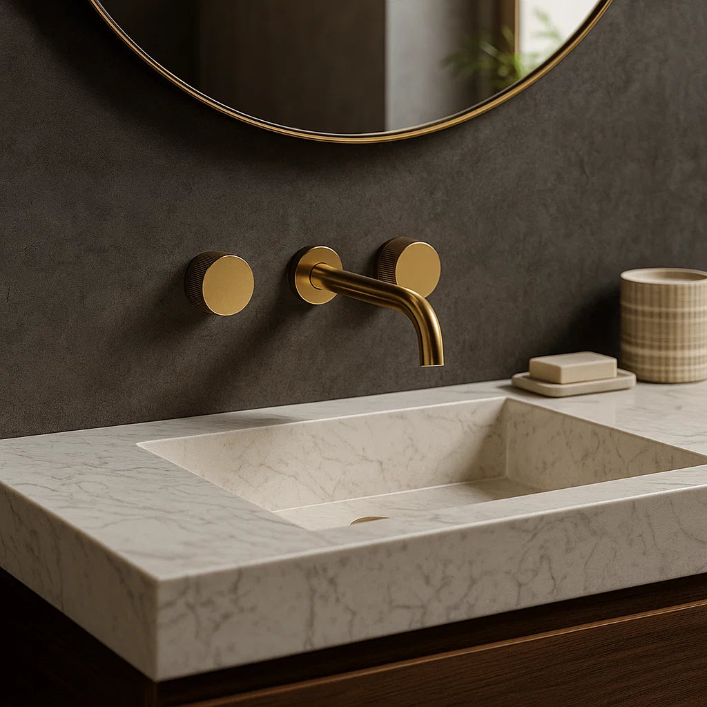 Seja qual for o estilo do seu projeto, o Misturador Nias se adapta com perfeição — disponível em acabamentos exclusivos para harmonizar com metais e acessórios do ambiente.