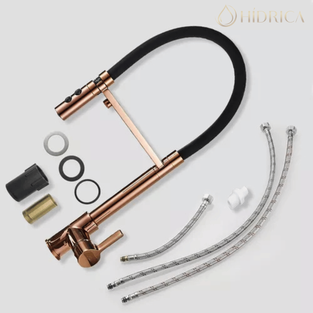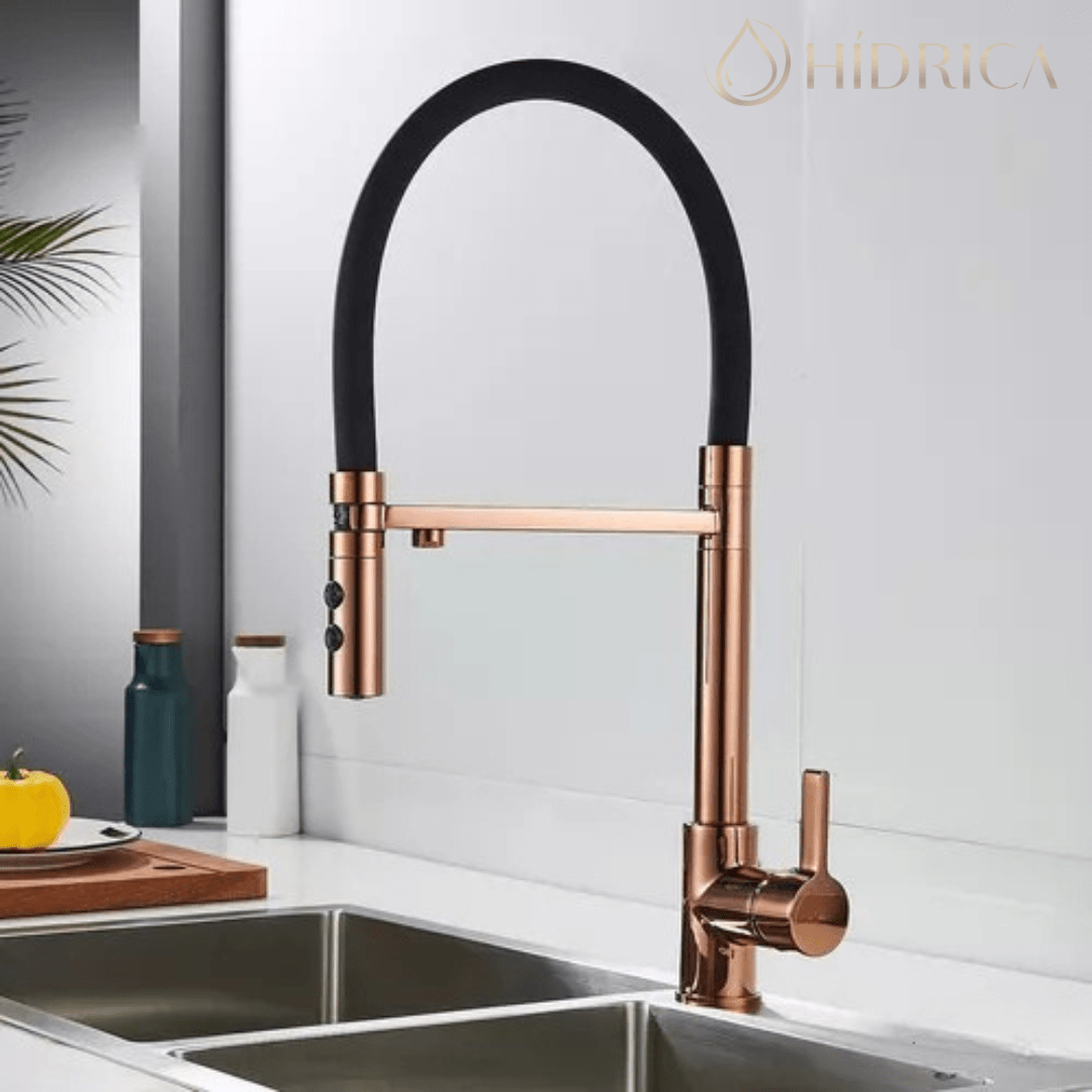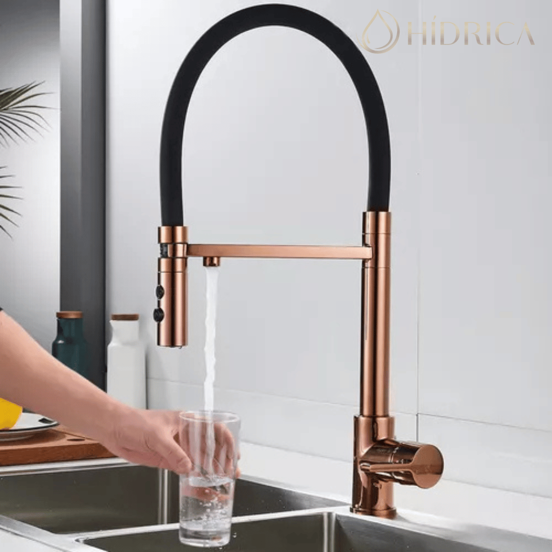A Torneira Gourmet Rosé Gold - Linha Lusso é mais do que um simples acessório de cozinha; é a união perfeita entre design moderno, praticidade e tecnologia. Projetada com o exclusivo misturador de triplo comando, oferece o controle total da vazão, da mistura de água quente e fria, e ainda conta com uma saída exclusiva para água filtrada, tudo em um só produto.