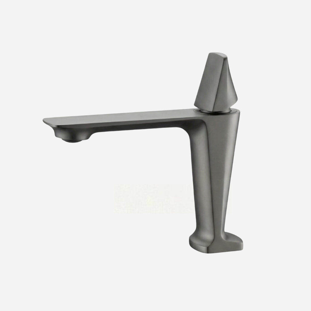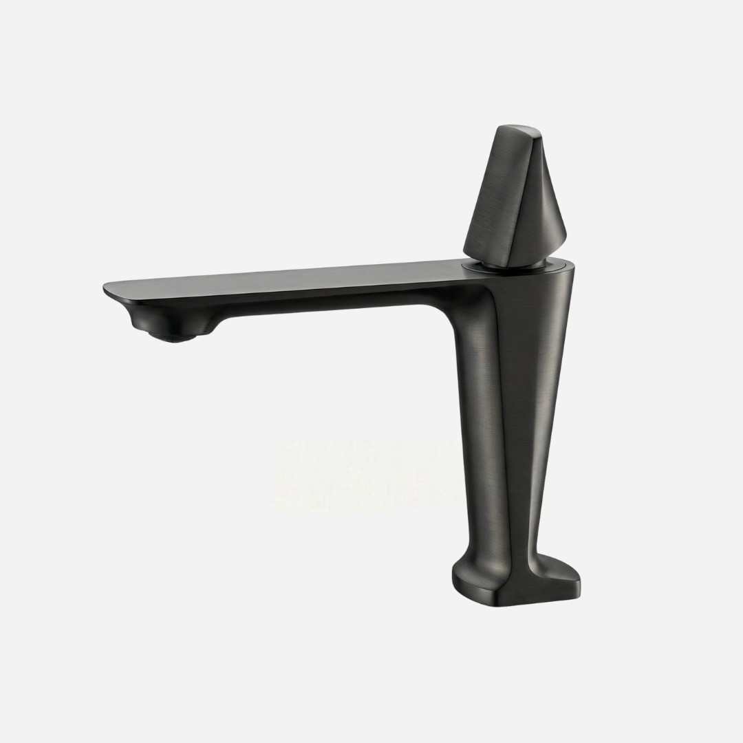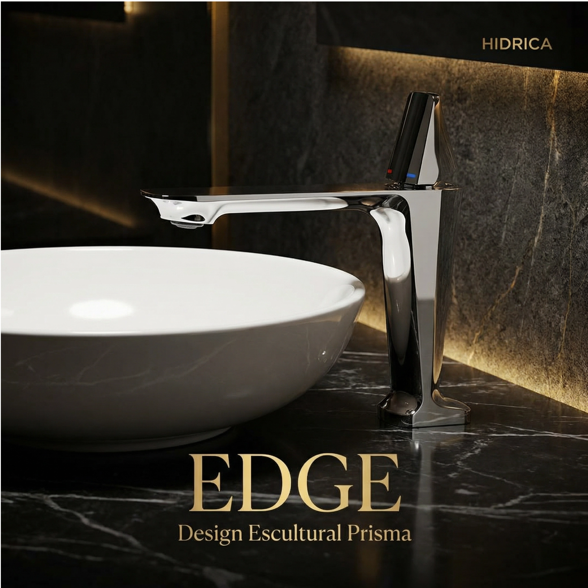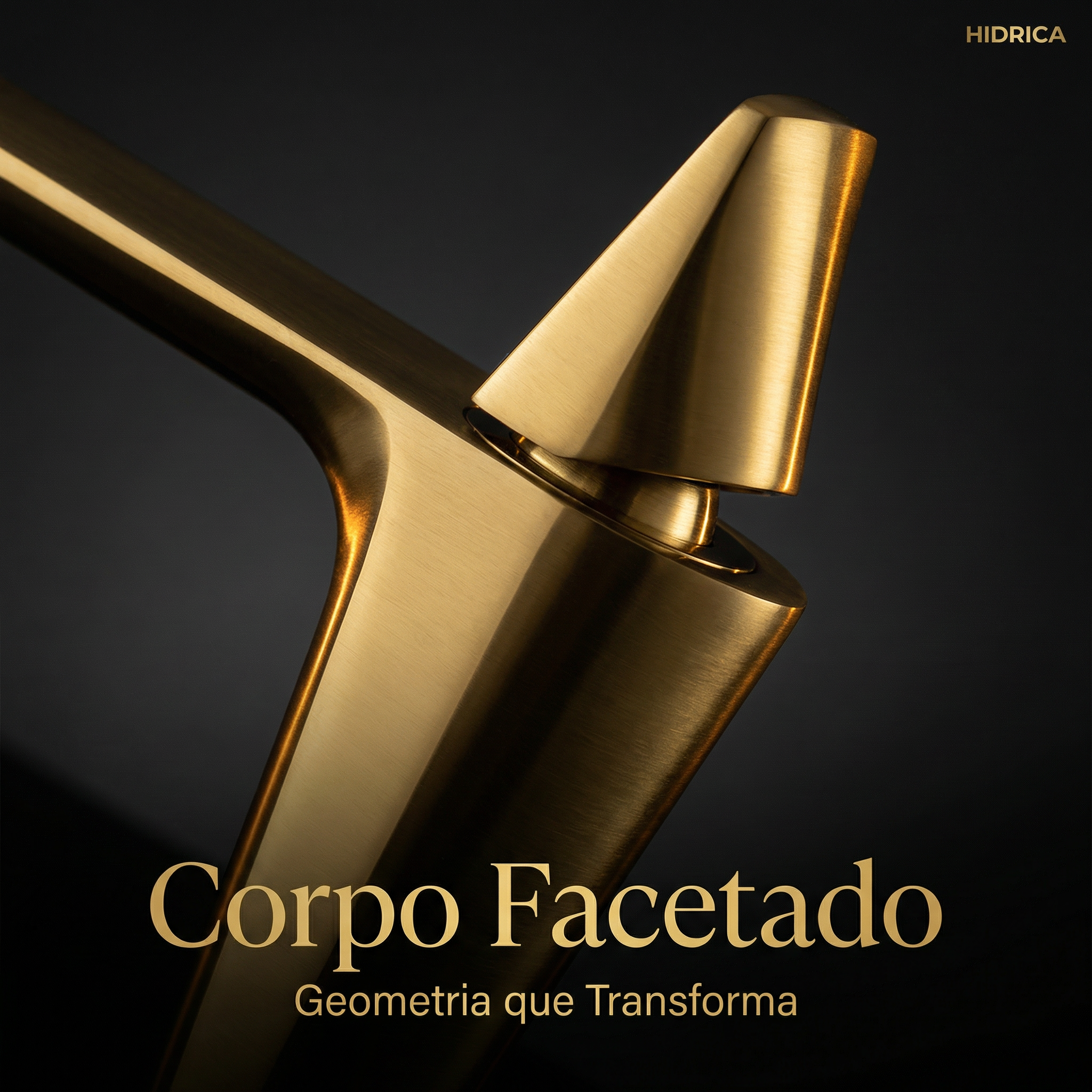 Inspirada na pureza das formas geométricas, a Torneira Edge traduz a precisão de um prisma em design funcional. Seu corpo facetado e angular cria um jogo de luz e sombra que transforma a torneira em uma verdadeira escultura sobre a bancada. Cada aresta foi pensada para comunicar presença e sofisticação.