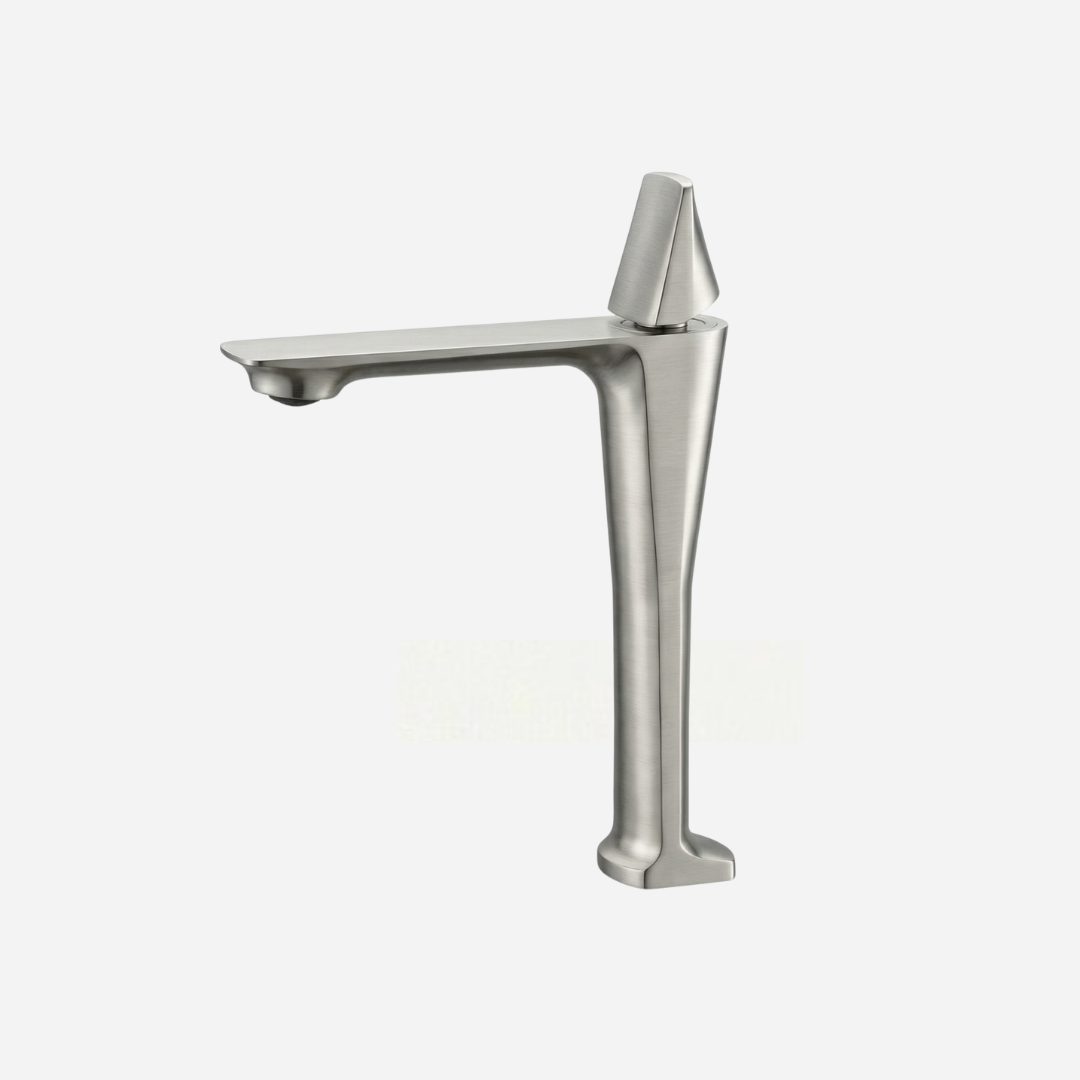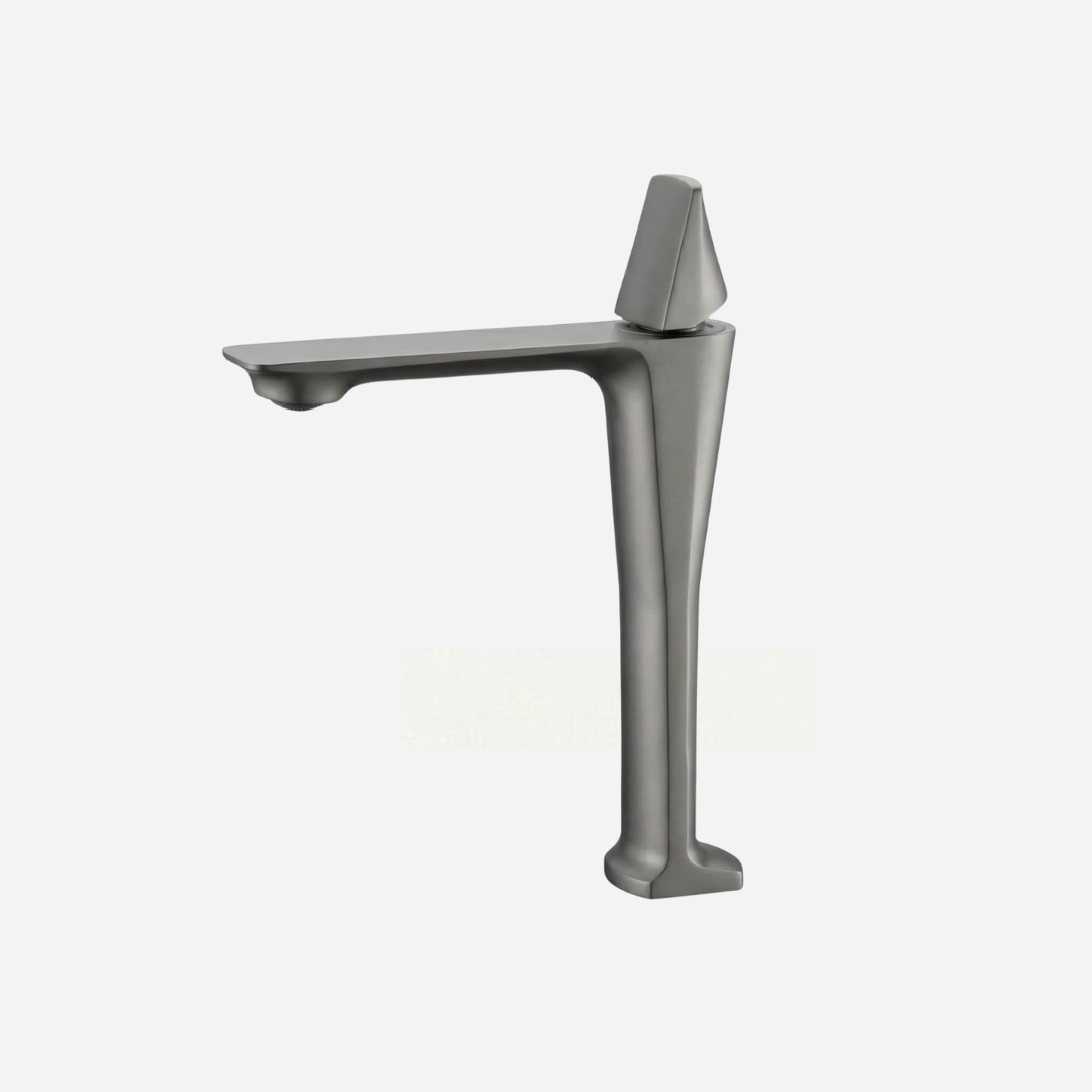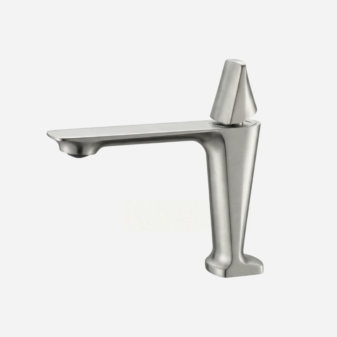 Inspirada na pureza das formas geométricas, a Torneira Edge traduz a precisão de um prisma em design funcional. Seu corpo facetado e angular cria um jogo de luz e sombra que transforma a torneira em uma verdadeira escultura sobre a bancada. Cada aresta foi pensada para comunicar presença e sofisticação.