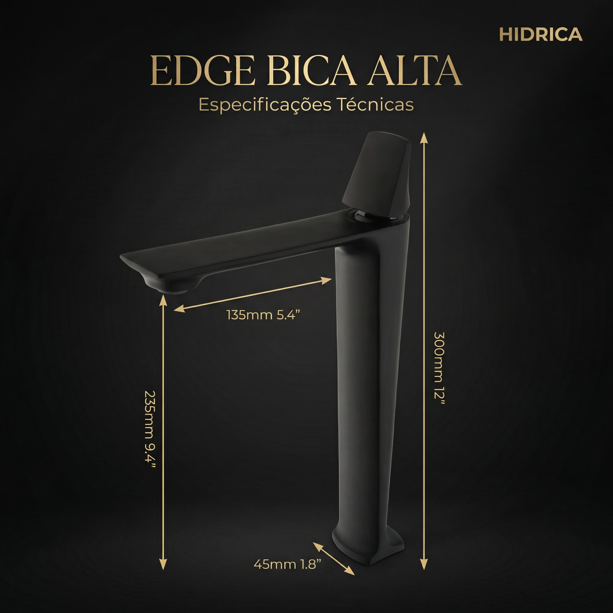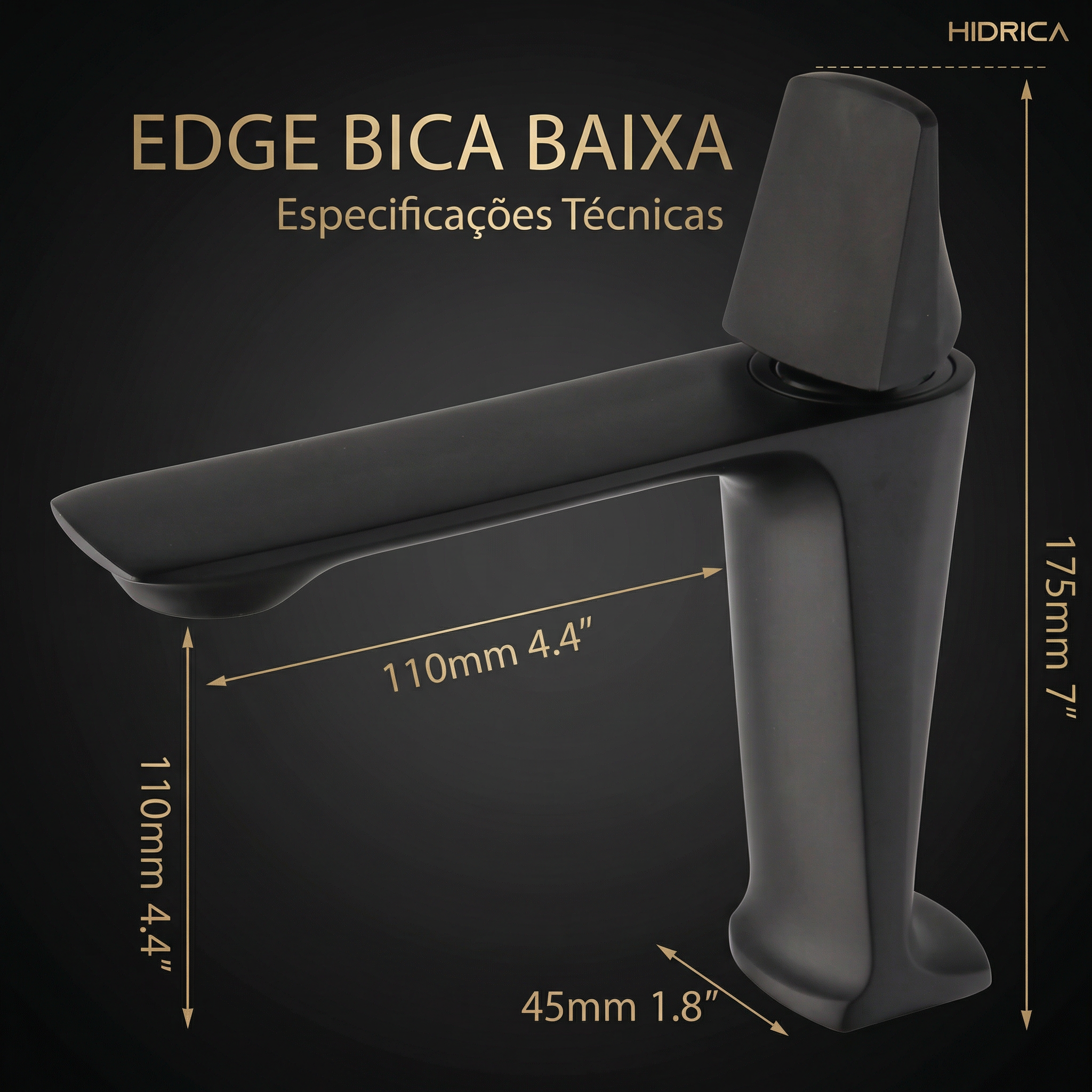 Fabricada em aço inoxidável 304 e revestida com pintura E-Coat de alta performance, a Edge combina resistência industrial com acabamento premium. O acionamento monocomando com cartucho cerâmico garante controle preciso de temperatura e vazão, enquanto a alavanca cônica complementa a linguagem geométrica do conjunto. Disponível em bica alta e bica baixa, adapta-se a qualquer configuração de cuba.