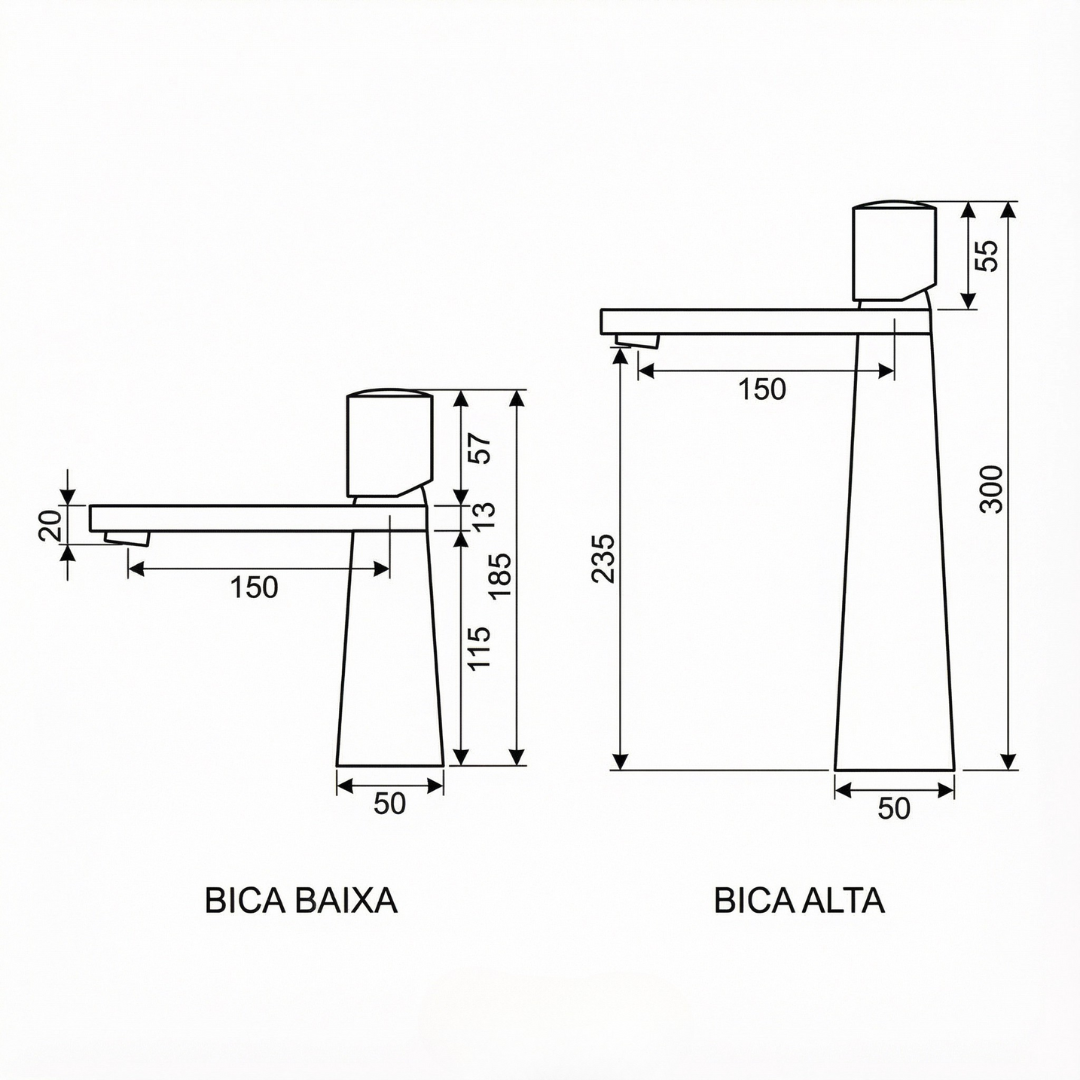 Disponível em duas alturas para atender diferentes necessidades: Bica Baixa para lavatórios convencionais e Bica Alta para cubas de apoio. Ambas compartilham o mesmo DNA de design e qualidade Hídrica.